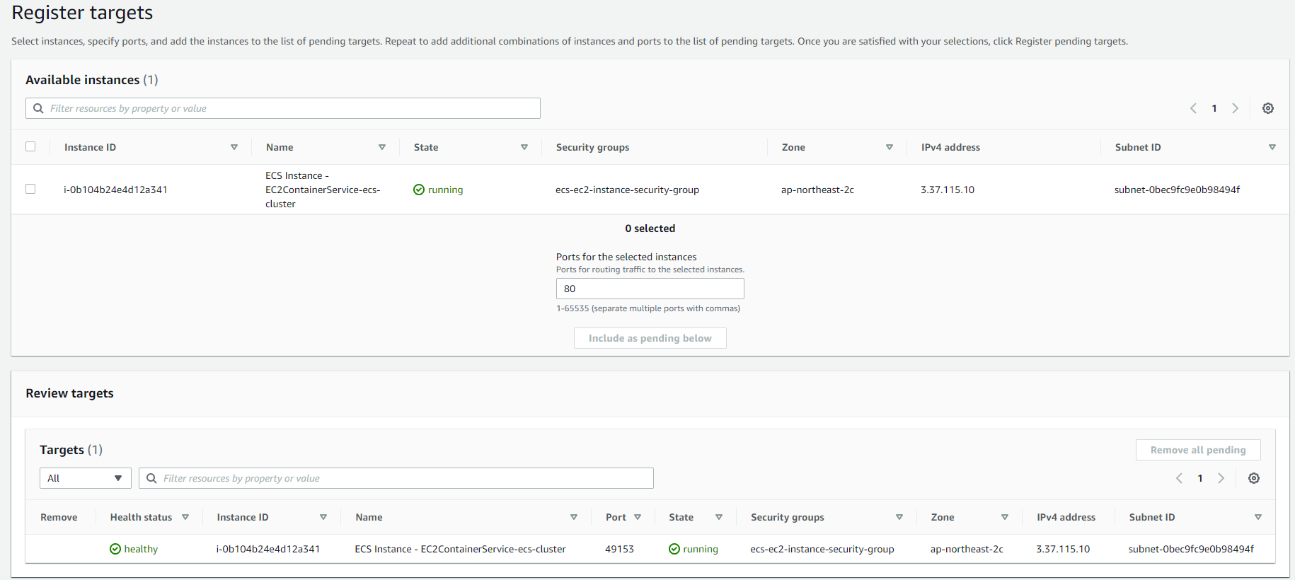 만약 ECS 설정이 정상적으로 되었고 배포까지 성공했다면 다음과 같이 타겟이 자동으로 매핑되어 있는 것을 확인할 수 있습니다.