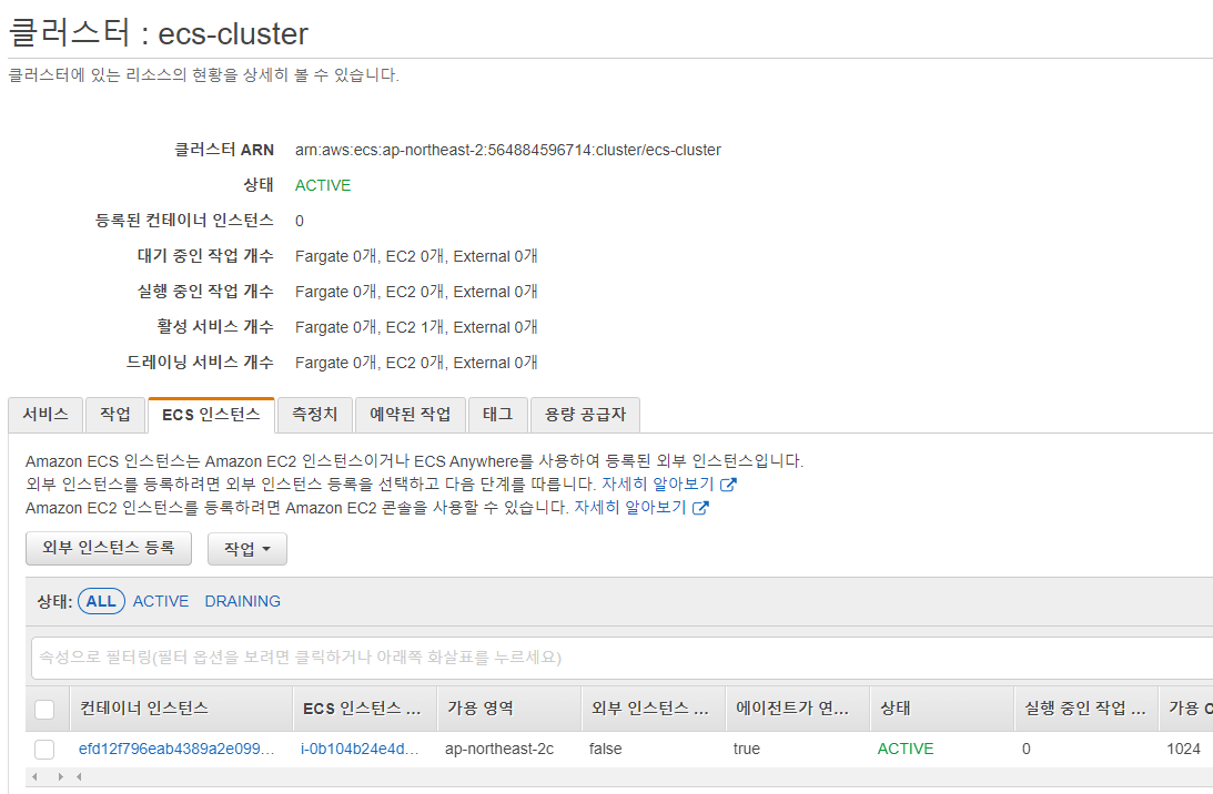 IP를 할당하고 나면 다음과 같이 ECS Cluster에서 인스턴스를 인지하기 시작합니다.