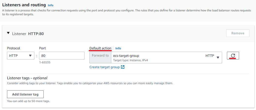 리스너 설정을 하기에 앞서 리스너 설정에 있는 Create target group를 먼저 클릭해줍니다.