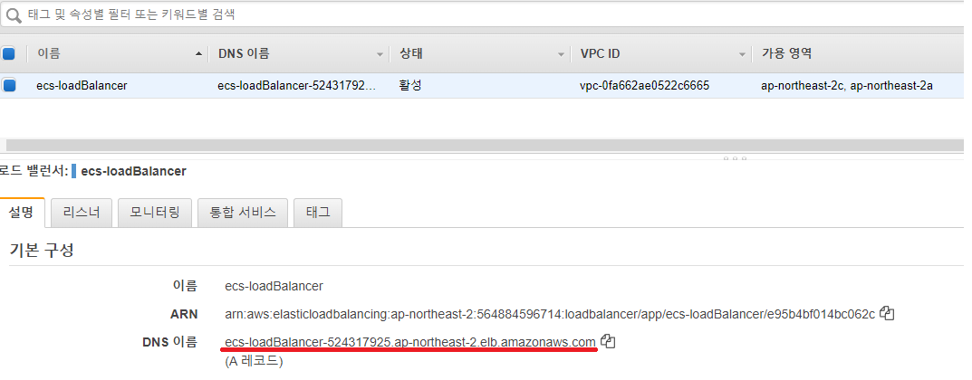 ALB 목록으로 가서 사용하고 있는 ALB를 클릭하면 다음과 같이 DNS 이름이 확인됩니다.