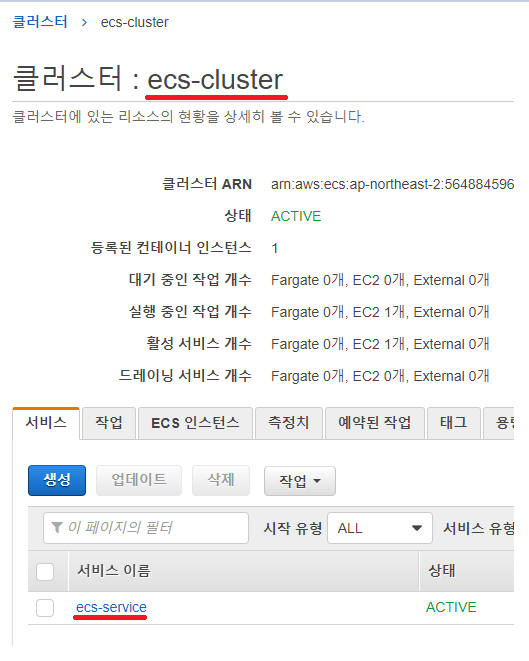 ECS에 접속하셔서 각자 생성한 ECS 정보를 다음과 같이 확인해주시면 됩니다.