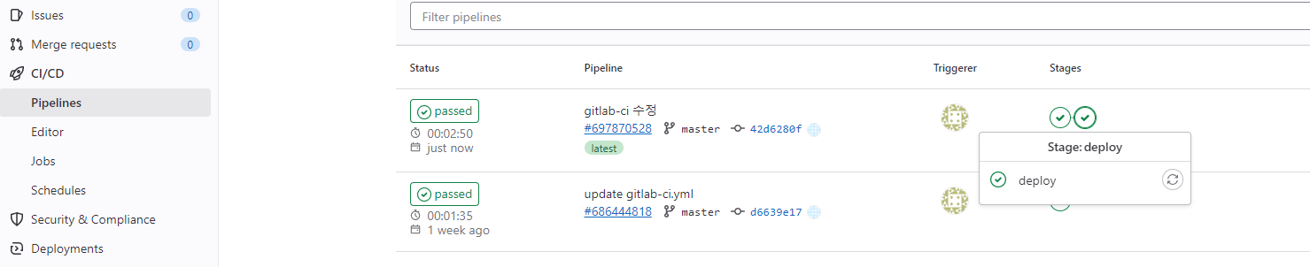 그러면 CI/CD 파이프라인이 생성되어 동작하고 정상적으로 설정이 완료되었을 경우 다음과 같이 deploy까지 pass가 완료됩니다.