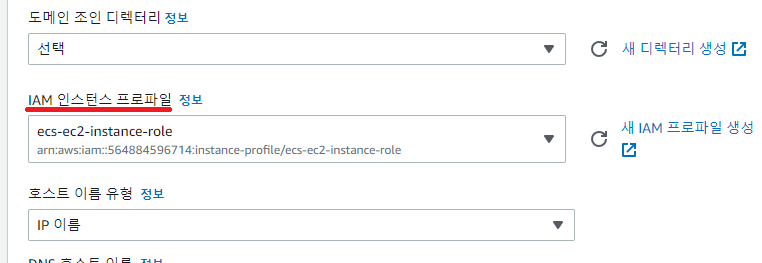 첫 번째는 IAM 인스턴스 프로파일인데 이곳에는 ECS 클러스터 생성할 때 만들어둔 인스턴스 role을 등록해줍니다.