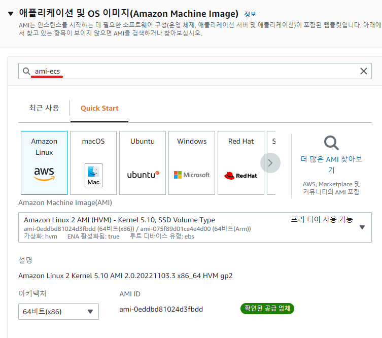 다음은 AMI를 추가해줘야 하는데 먼저 검색창에 ami-ecs를 입력한 뒤 엔터를 눌러서 검색이 되도록 합니다.