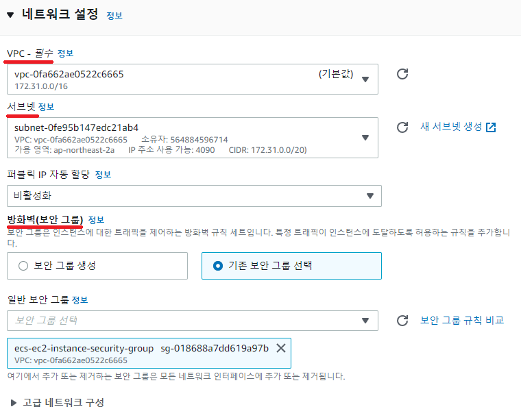 그리고 VPC는 ECS 클러스터를 생성할 때 선택한 VPC, 서브넷도 ECS 클러스터를 생성할 때 선택한 서브넷 중 하나를 선택해주고 마지막으로 보안 그룹은 기존 ECS 인스턴스에서 사용되고 있는 보안 그룹을 선택해줍니다.