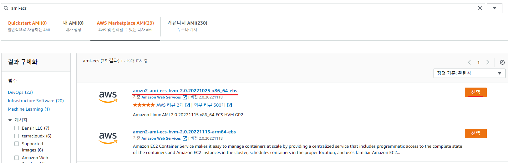 그러면 다음과 같이 검색되는 내용들이 보이는데 이 중 amzn2-ami-ecs-hvm-2.0.20221025-x86_64-ebs를 선택해줍니다.