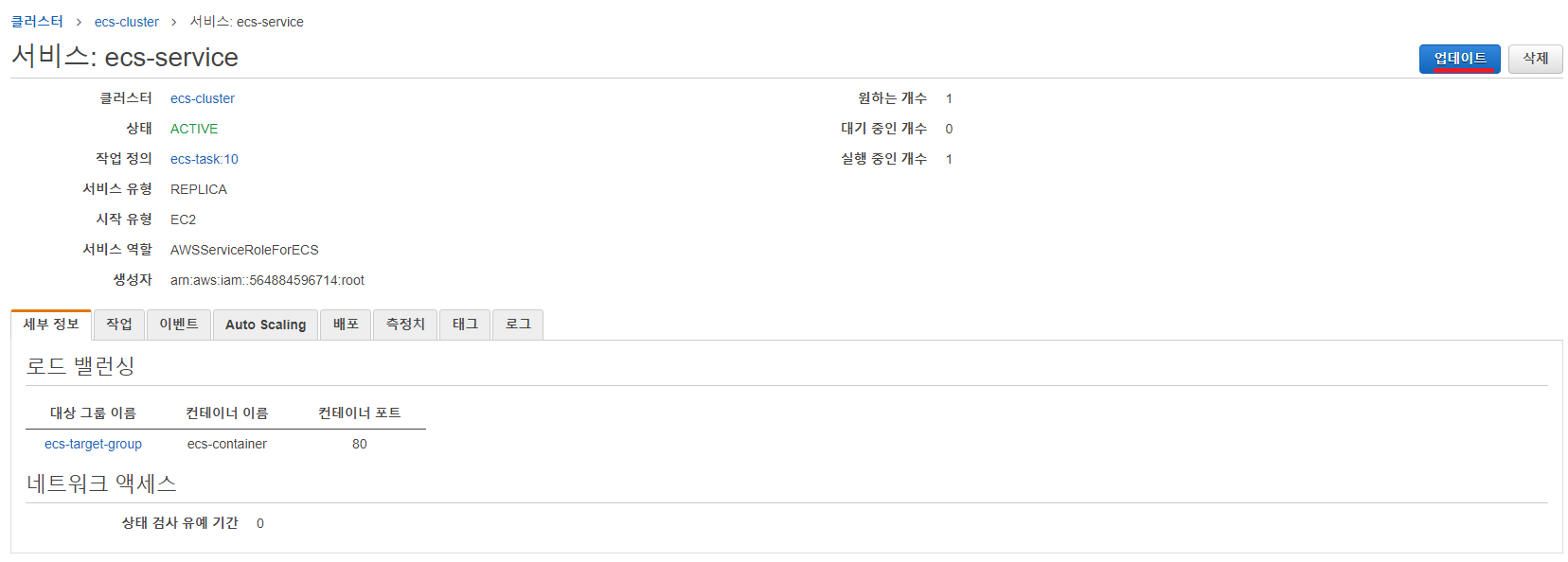 여기에서 다음 절차를 통해 ECS 서비스의 작업 개수를 2개로 업데이트하겠습니다.