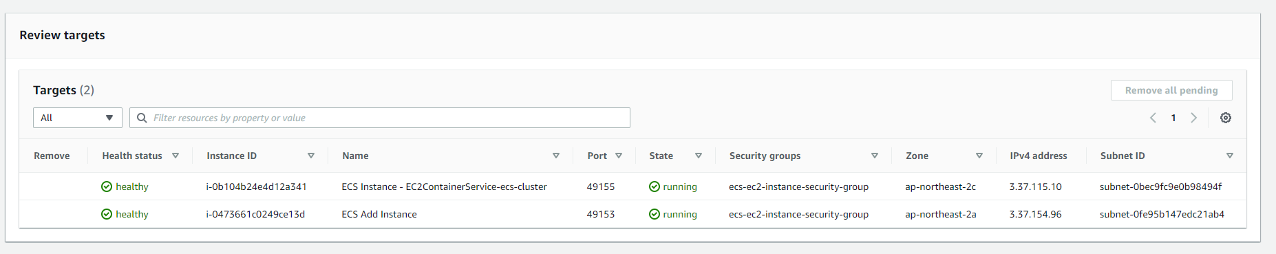 변경된 사항이 적용될 수 있도록 잠시 기다린 뒤 타겟 그룹을 확인하면 다음과 같이 추가한 ECS 인스턴스에 포트가 매핑되어 실행되는 것을 확인할 수 있습니다.