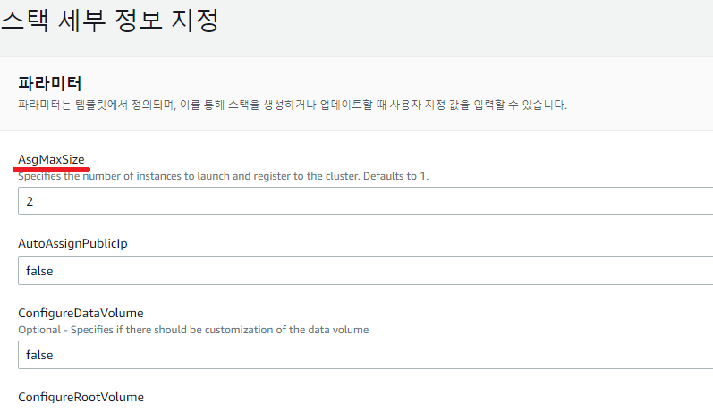 여기서 필요한 설정들을 변경해주시면 되고, 저는 인스턴스를 1개에서 2개로 늘릴 것이기 때문에 AsgMaxSize를 1에서 2로 변경해줬습니다.