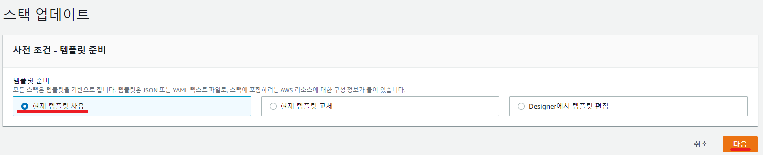 스택 업데이트에서는 현재 템플릿 사용을 선택해주면 됩니다.