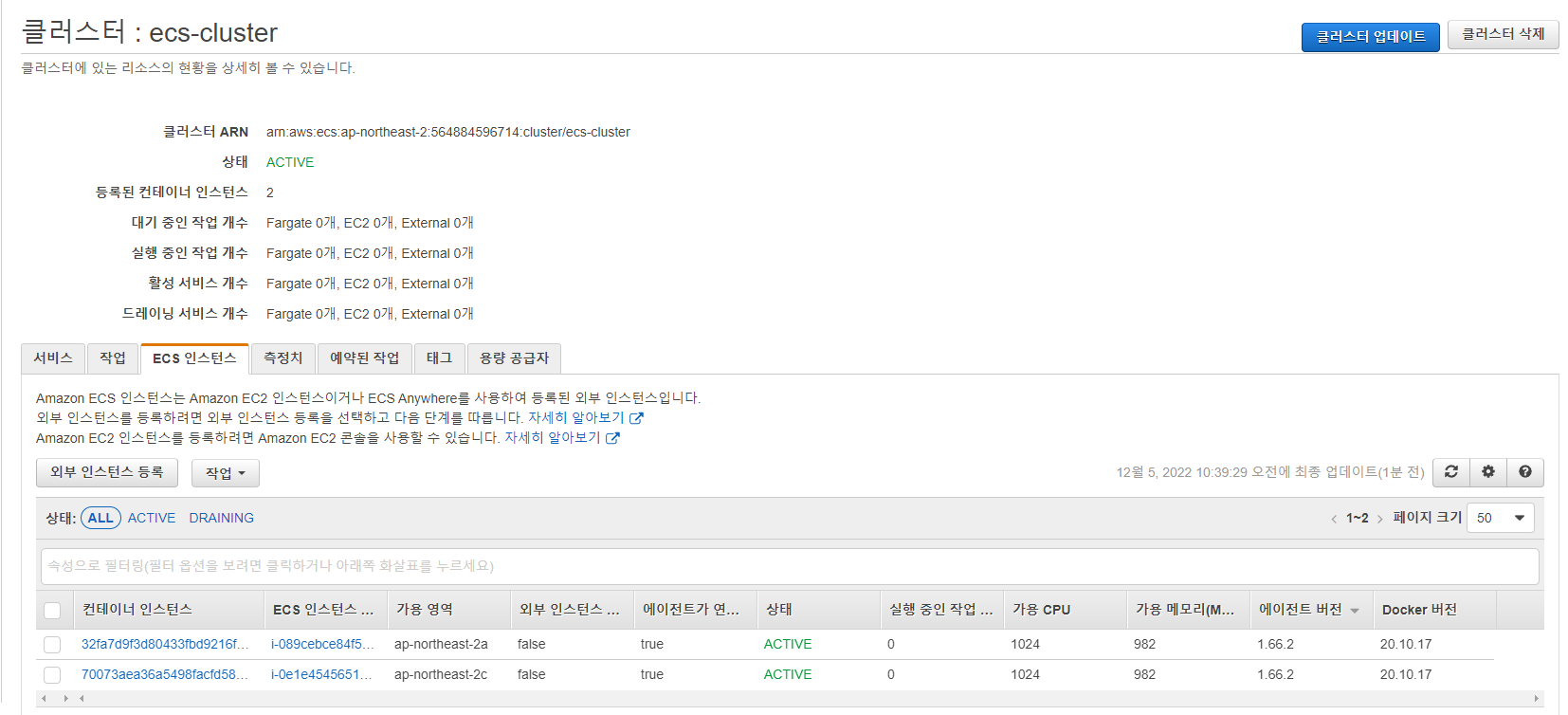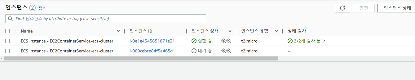 그러면 ECS 클러스터 인스턴스 목록에 다음과 같이 확인되는 것을 볼 수 있습니다.