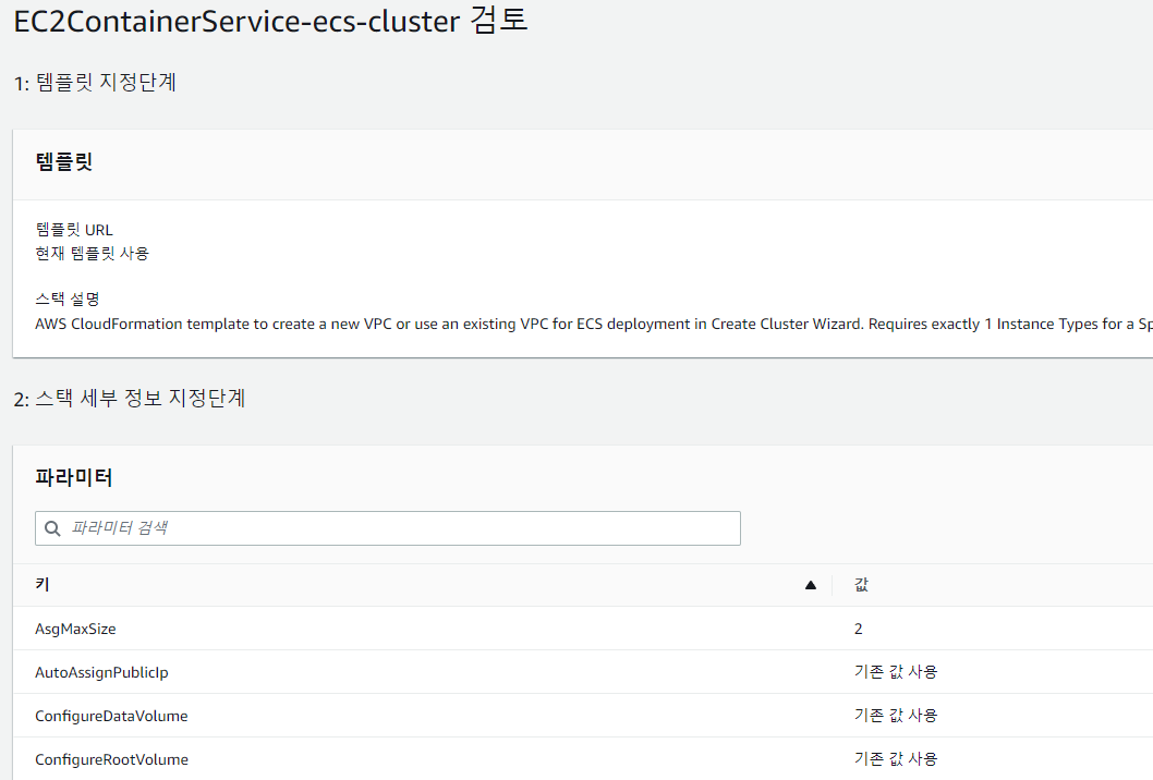 스택 세부 정보 지정에서는 기존에 설정한 ECS 설정들이 담겨있습니다.