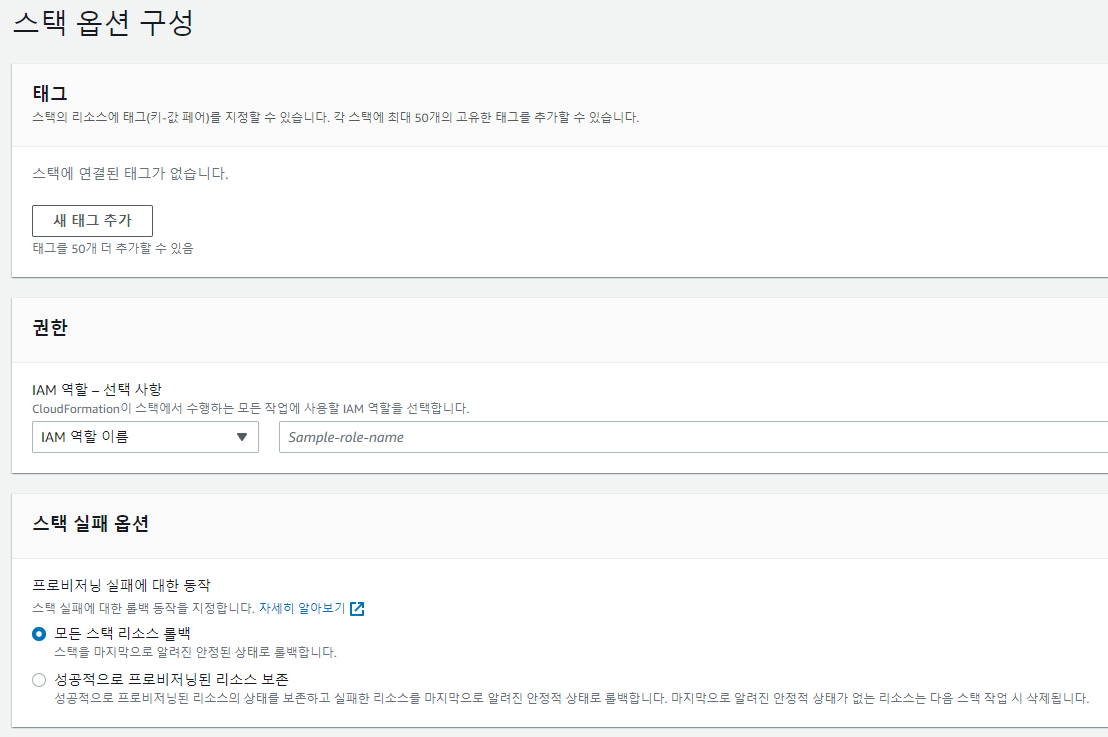 스택 옵션 구성에서는 변경된 스택의 옵션들을 설정해주면 됩니다.
