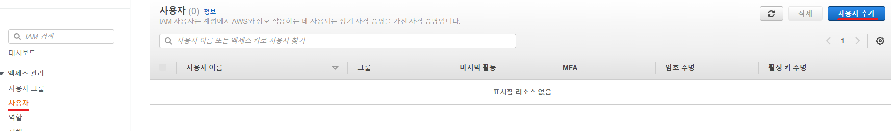좌측에서 사용자 메뉴를 선택한 뒤 우측에 있는 사용자 추가 버튼을 클릭합니다.