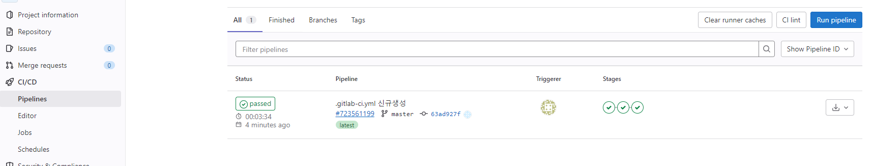 모든 설정이 끝났다면 .gitlab-ci.yml이 실행될 수 있게 push를 해줍니다.