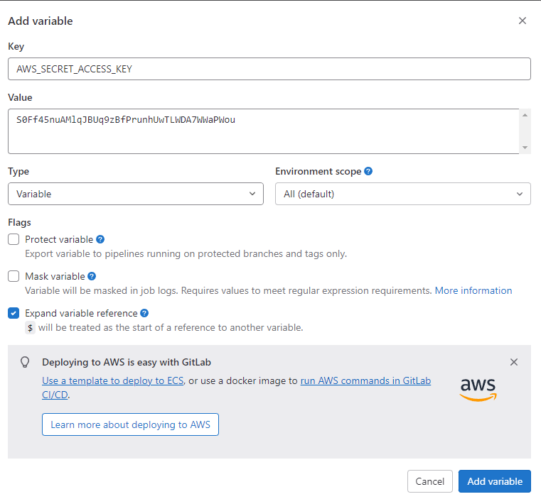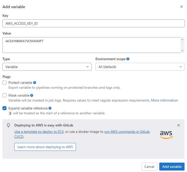 필요한 변숫값들은 AWS_ACCESS_KEY_ID와 AWS_SECRET_ACCESS_KEY, AWS_DEFAULT_REGION이 있습니다.