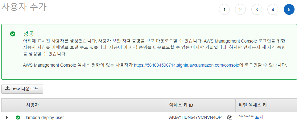 여기서 보이는 액세스 키 ID와 비밀 액세스 키 값은 아래에서 사용될 예정이니 csv로 다운로드를 하던 키 값을 어딘가에 저장해둠으로 써 보관을 해줘야 합니다.