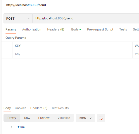 다음과 같이 포스트맨을 이용하여 /send에 해당되는 api를 호출하였고 정상적으로 처리되어 true라는 결과를 전달받았습니다.