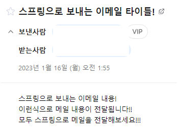 그리고 메일을 전달받는 이메일로 접속해서 확인했더니 다음과 같이 받은 메일함에 스프링에서 작성했던 내용이 담겨있는 것을 확인할 수 있습니다.