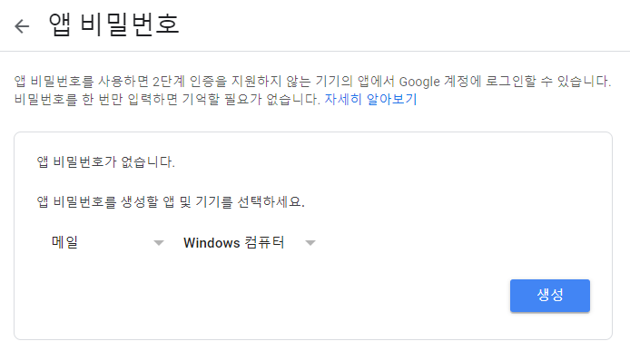[ 5. 앱 비밀번호 생성하기 - 비밀번호 생성 앱 및 기기 선택 ]