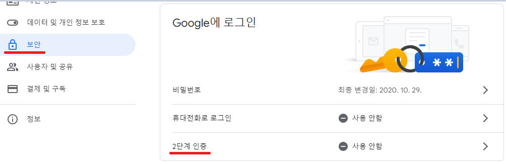 2단계 인증이 완료되었다면 다시 Google 계정의 보안 메뉴로 넘어가줍니다.