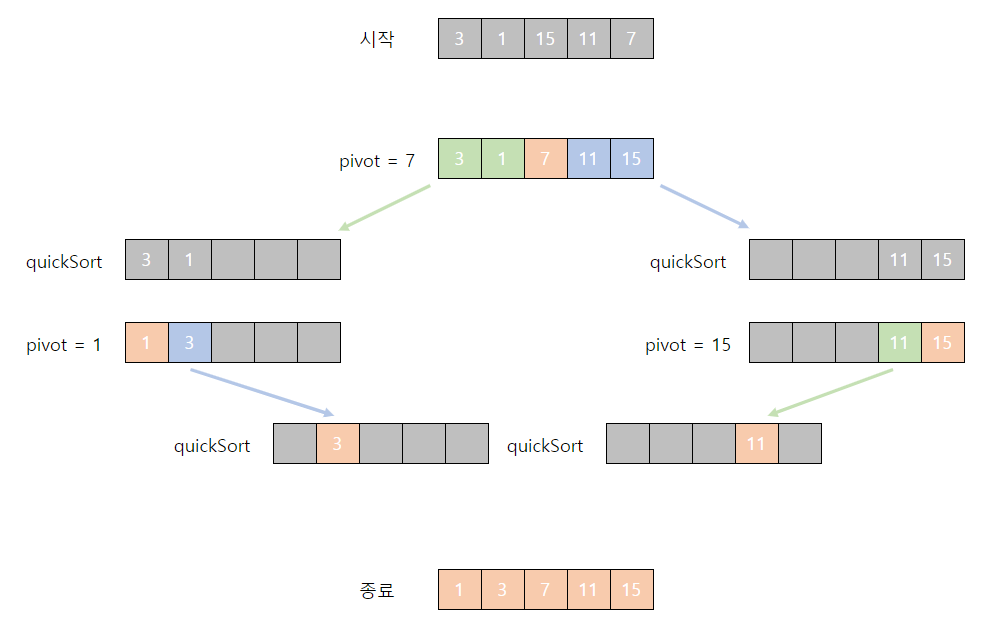 1-2. pivot값은 7이 되며 pivot을 기준으로 작은 원소인 {3, 1}, 큰 원소인 {11, 15}로 분할시킵니다.
