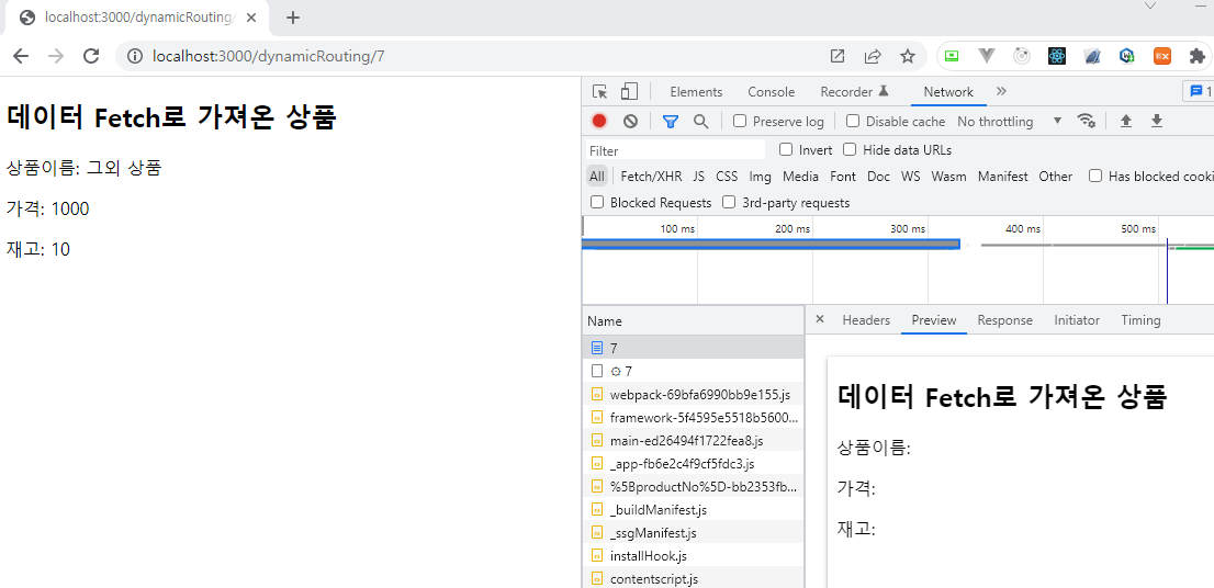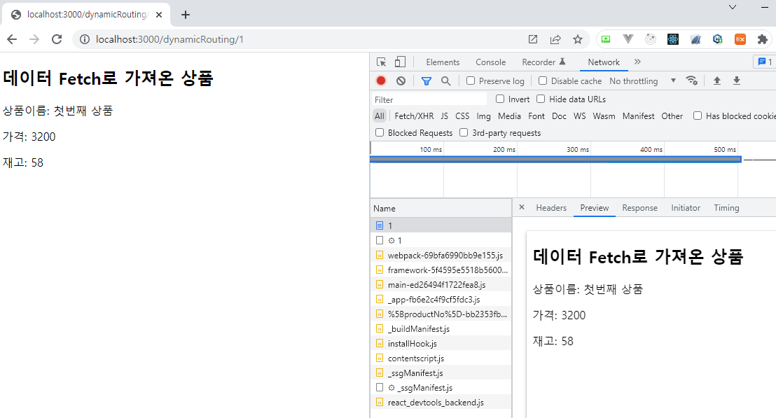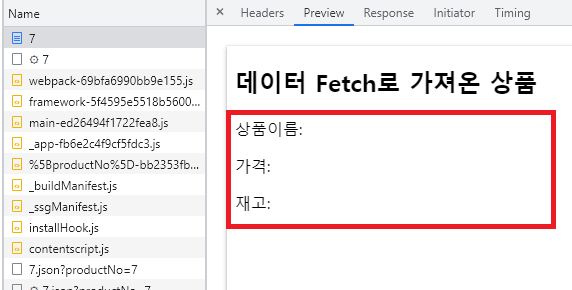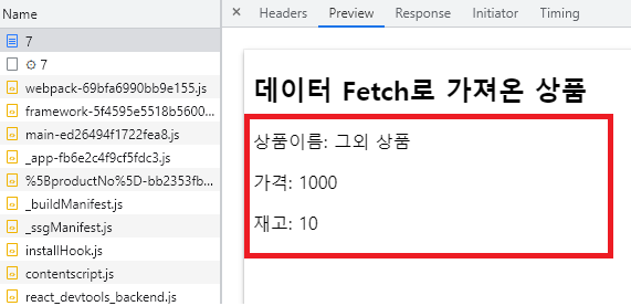 실행된 화면을 확인해보면 prerendering이 되었기 때문에 Preview에 fetching data들이 정상적으로 보이는 것을 확인할 수 있습니다.