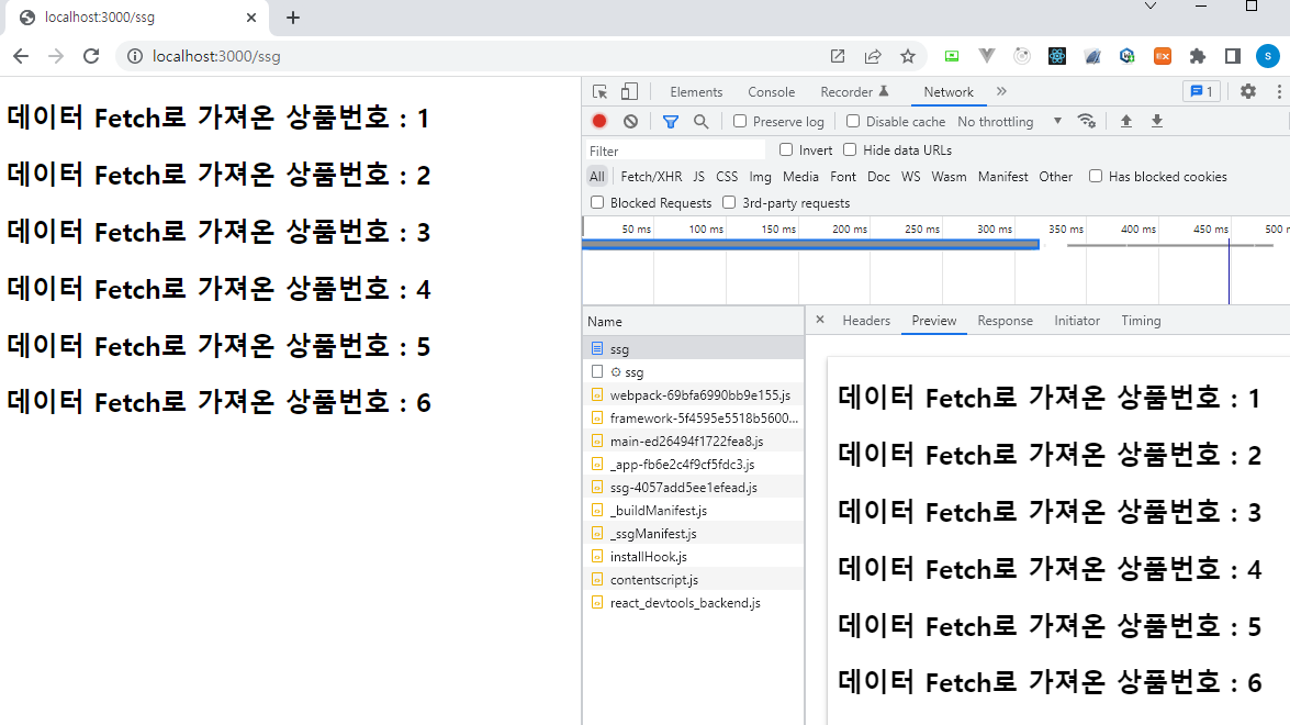 화면이 동일하게 보이는 이유는 위에서 얘기했던 것처럼 SSG는 build 단계 때 fetching 될 데이터를 prerendering 하여 캐싱처리를 하고 있기 때문입니다.