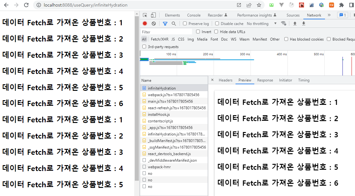 코드를 작성한 뒤 서버를 실행해보면 다음과 같이 prerendering이 된 결과물을 확인할 수 있으며 infiniteQuery도 정상적으로 적용되어 infinite scroll이 사용되고 있는 것을 확인할 수 있습니다.