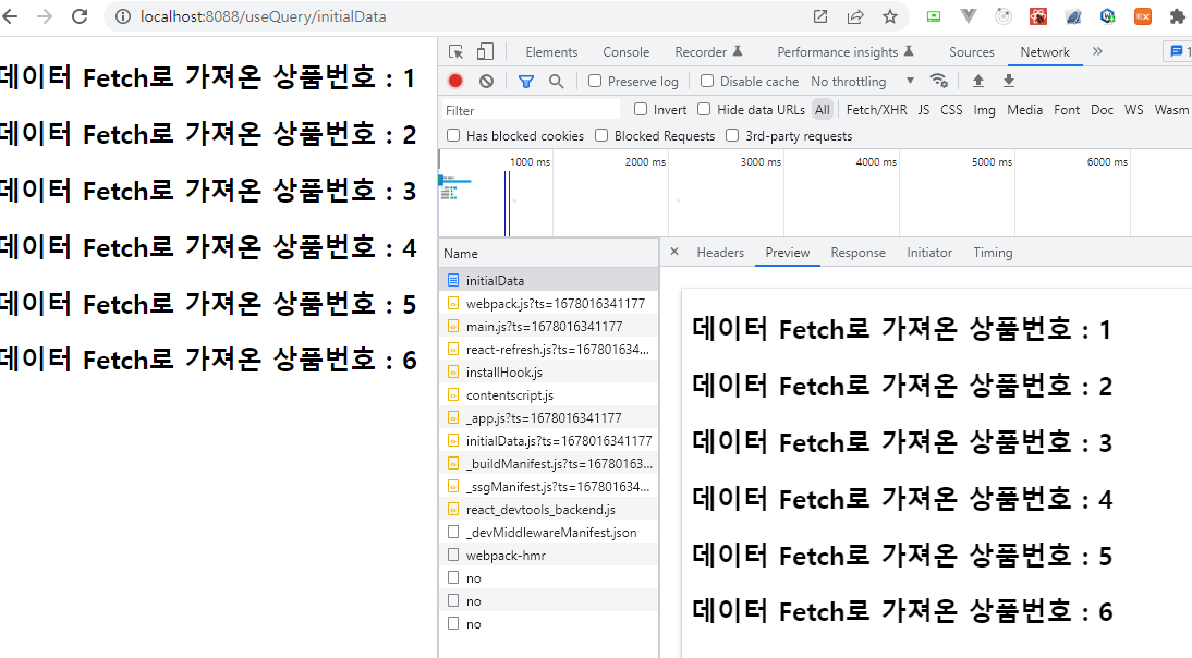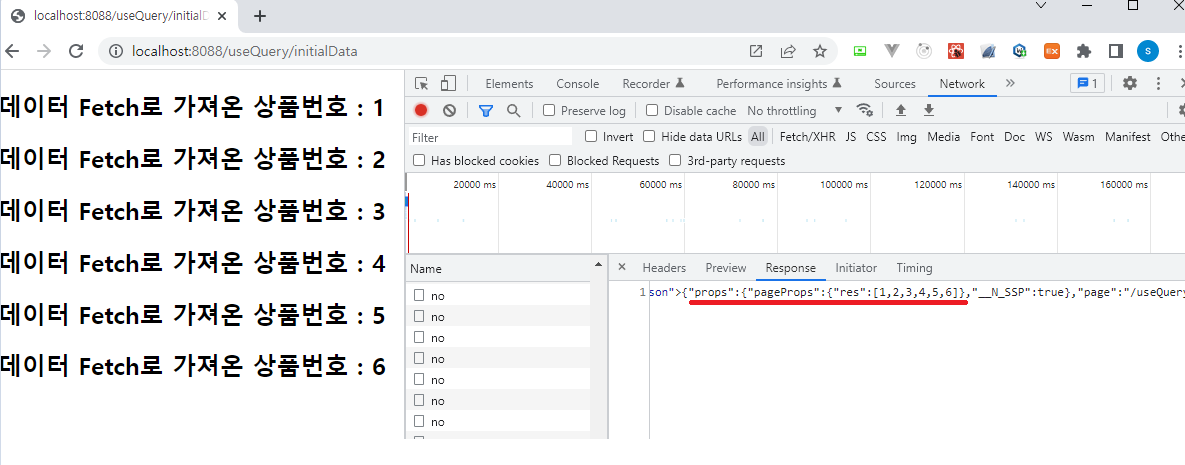 코드를 작성한 뒤 서버를 실행해보면 다음과 같이 prerendering이 되어 Preview에 fetching 된 데이터들이 보이는 것을 확인할 수 있습니다.