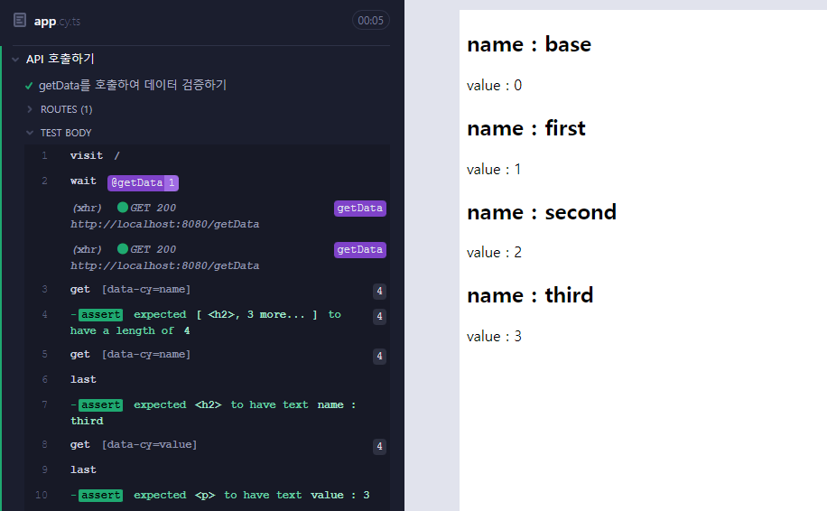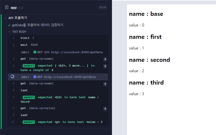 api에는 강제로 5초 뒤에 response를 전달하도록 설정을 해놨고 위의 코드를 이용하여 cypress 테스트 코드를 작성해 보면 다음과 같은 결과를 확인할 수 있습니다.