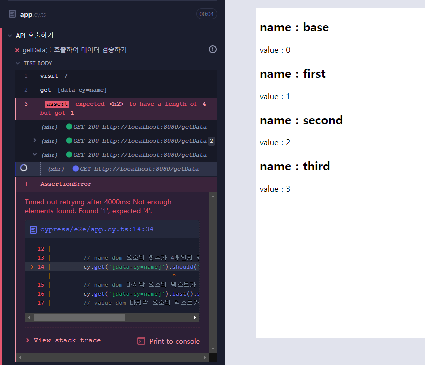결과를 확인해보면 화면에는 데이터를 올바르게 가져와 그려주고 있지만 cypress는 api 요청에 대한 응답을 끝까지 기다리지 않고 결과를 출력하여 테스트가 실패하는 모습을 볼 수 있습니다.