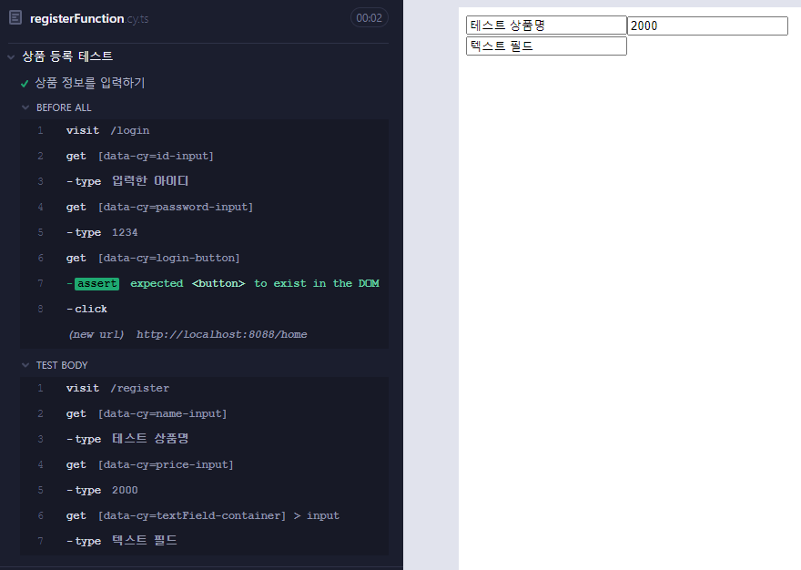 소스를 모두 변경하고 register.cy.ts에 대한 테스트를 돌려보면 다음과 같은 결과를 확인할 수 있습니다.