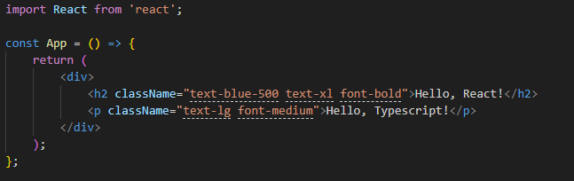 <h2 className="text-blue-500 text-xl font-bold">Hello, React!</h2>