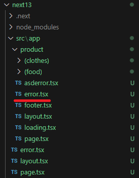 이와 동일한 기능을 적용하기 위해서 next13 이후로는 page, layout과 동일한 depth에 error 파일을 생성해 볼 수 있습니다.