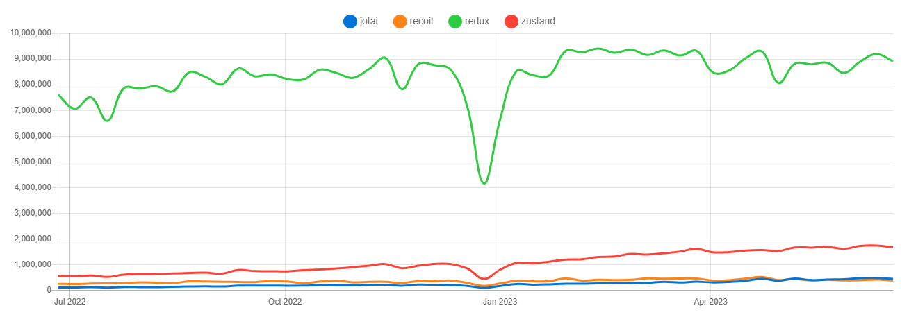 react에서 활용되는 상태 관리 라이브러리들은 여러 개가 있는데 대표적으로 redux, zustand, jotai, recoil 등이 존재하며 최근 npm 트렌드를 확인해 보면 redux 다음으로 가장 많이 활용되는 라이브러리라고 볼 수 있습니다.