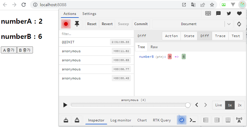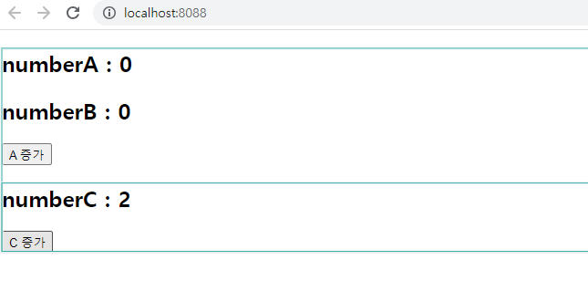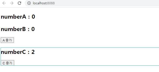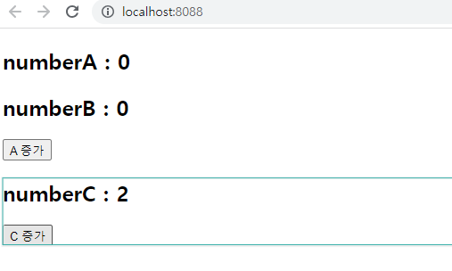 그리고 위와 동일하게 C 증가 버튼을 클릭하면 numberA, numberB의 값은 변화가 없지만 저장되는 메모리 주소 값이 변경되기 때문에 "strict equality (old === new)"에 해당되지 않아 page 전체가 함께 리렌더링 되는 것을 볼 수 있습니다.