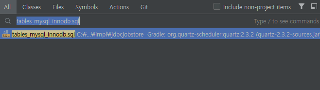 인텔리제이를 통해 개발을 하고 계시다면 "Shift + Shift"를 누른 뒤 "tables_mysql_innodb.sql"를 입력하면 다음과 같이 파일 하나가 조회되는 것을 볼 수 있습니다.