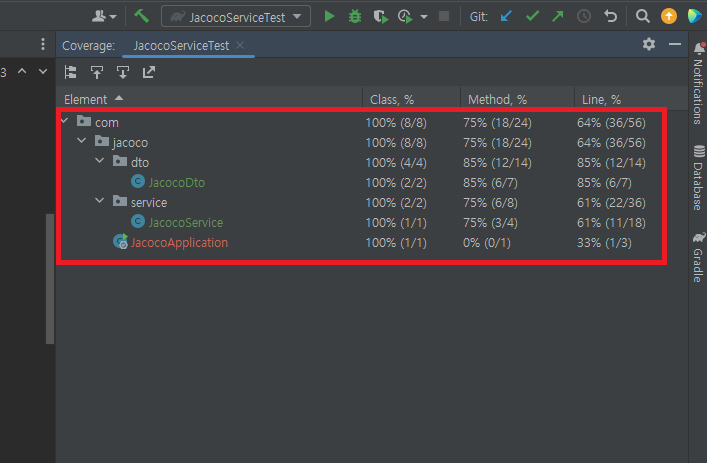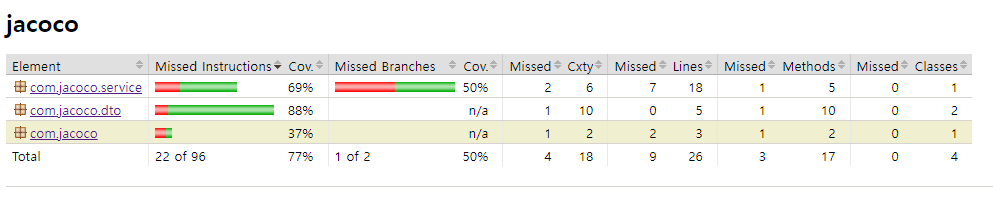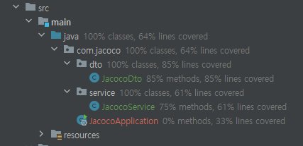 즉, Jacoco를 활용한다면 프로젝트에서 작성된 테스트 코드들이 전체 소스 코드 중 어느 수준까지 적용되고 있는 것을 확인할 수 있게 되고 커버리지 비율이 높을수록 전체 소스에 대한 테스트 케이스가 많이 작성된 것을 알 수 있습니다.