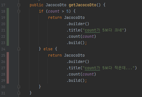 마지막으로 소스 파일에 들어가 보면 커버리지에 포함된 코드와 포함되지 않은 코드를 다음과 같이 표현해 줍니다.
