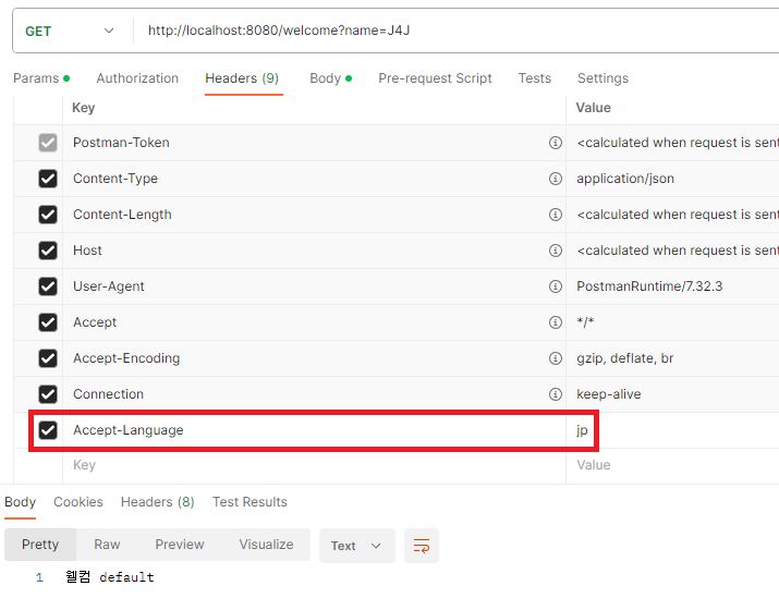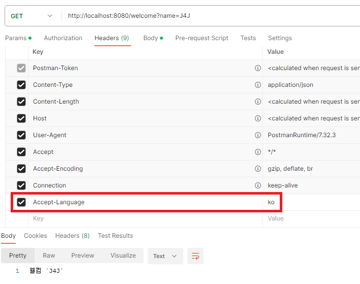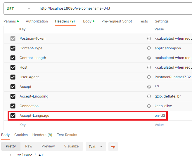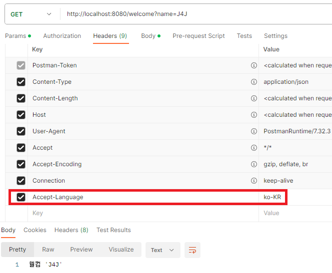 // header의 Accept-Language 값을 이용하여 메세지 처리할 언어 선택