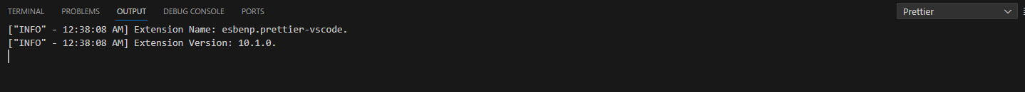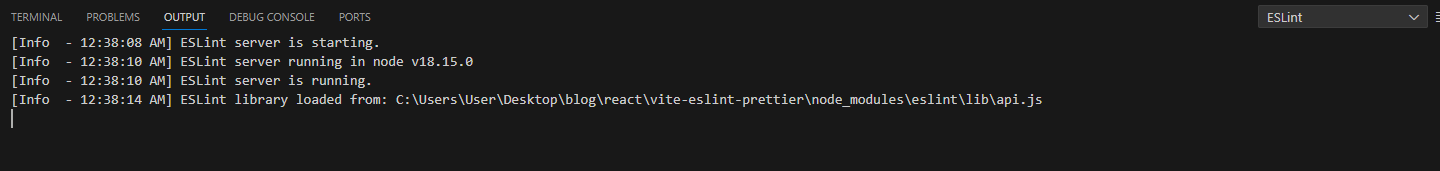로그 확인은 아래 터미널쪽에 있는 OUTPUT 탭을 클릭하여 다음과 같이 ESLint 또는 Prettier을 선택하여 출력된 결과물을 볼 수 있습니다.