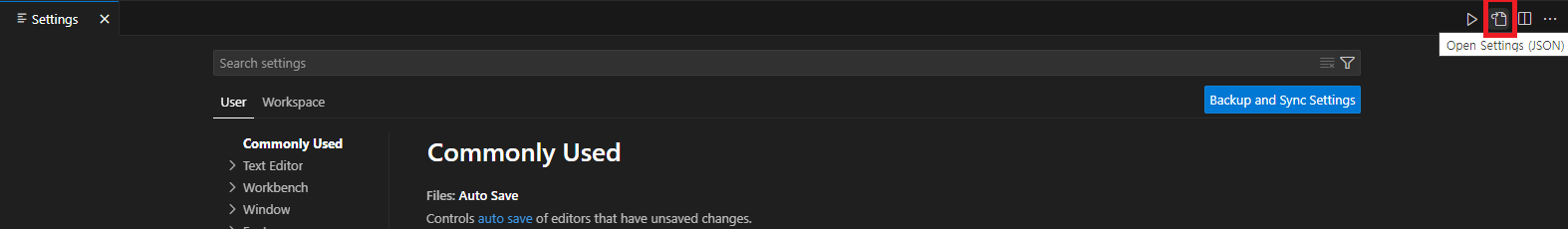 "ctrl + ," 키를 눌러보면 다음과 같이 Settings가 열리는 것을 확인할 수 있고 우측 상단에 보시면 JSON 파일로 설정할 수 있도록 변경해주는 아이콘이 있는 것을 볼 수 있습니다.