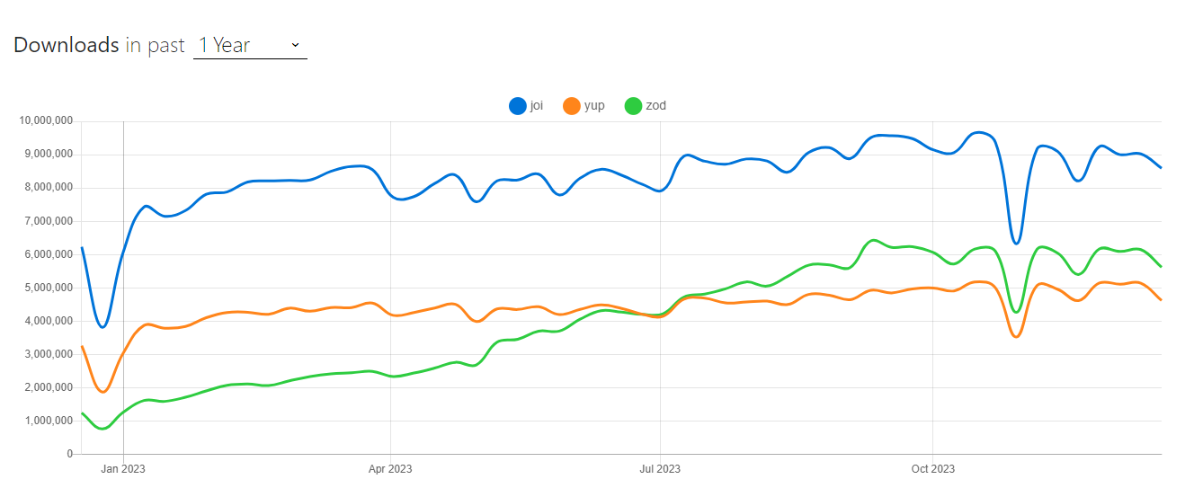 대표적으로 yup과 joi가 존재하며 zod를 포함한 npm trend는 다음과 같습니다.