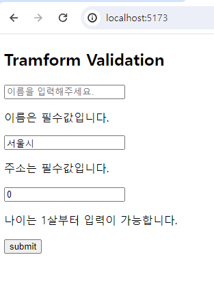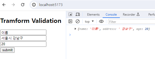 transform은 말 그대로 변환하는 것을 의미하며 입력되는 값을 원하는 형태로 변경한 뒤 검증하고 싶을 때 활용할 수 있습니다.