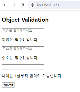 코드를 작성하고 submit 버튼을 클릭하면 다음과 같이 올바르지 않은 입력 값에 대한 에러가 발생되는 것을 볼 수 있습니다.