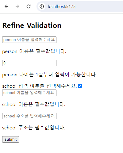 하지만 체크박스를 선택하면 다음과 같이 school 정보 또한 유효성 검증 대상이 되는 것을 볼 수 있습니다.