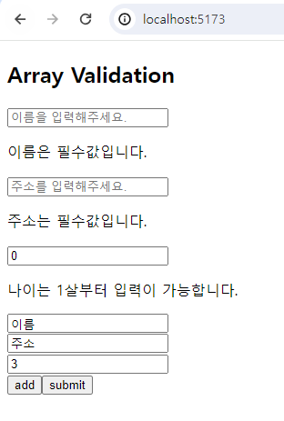 그러면 다음과 같이 동적으로 추가되는 값들에 대한 유효성 검증을 한 번에 수행하는 것을 볼 수 있습니다.