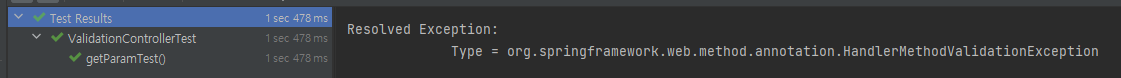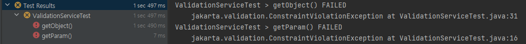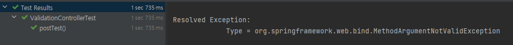 API를 위와 같이 생성한 뒤 유효성 검증에 실패하는 테스트 코드를 작성하여 동작시키면 다음과 같은 결과를 확인할 수 있습니다.