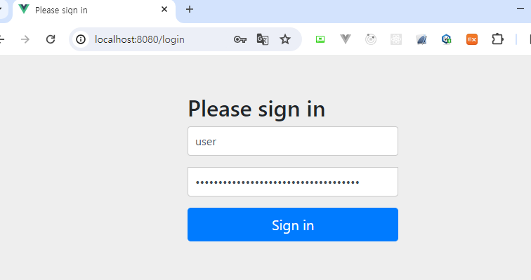 해당 페이지에서 위에서 확인한 계정 정보를 다음과 같이 입력을 하여 로그인이 이루어졌다면 securityConfig에 설정한 대로 /home 경로로 redirect 되어야 정상 작동한 것입니다.